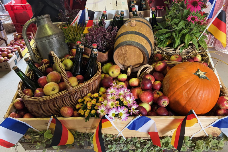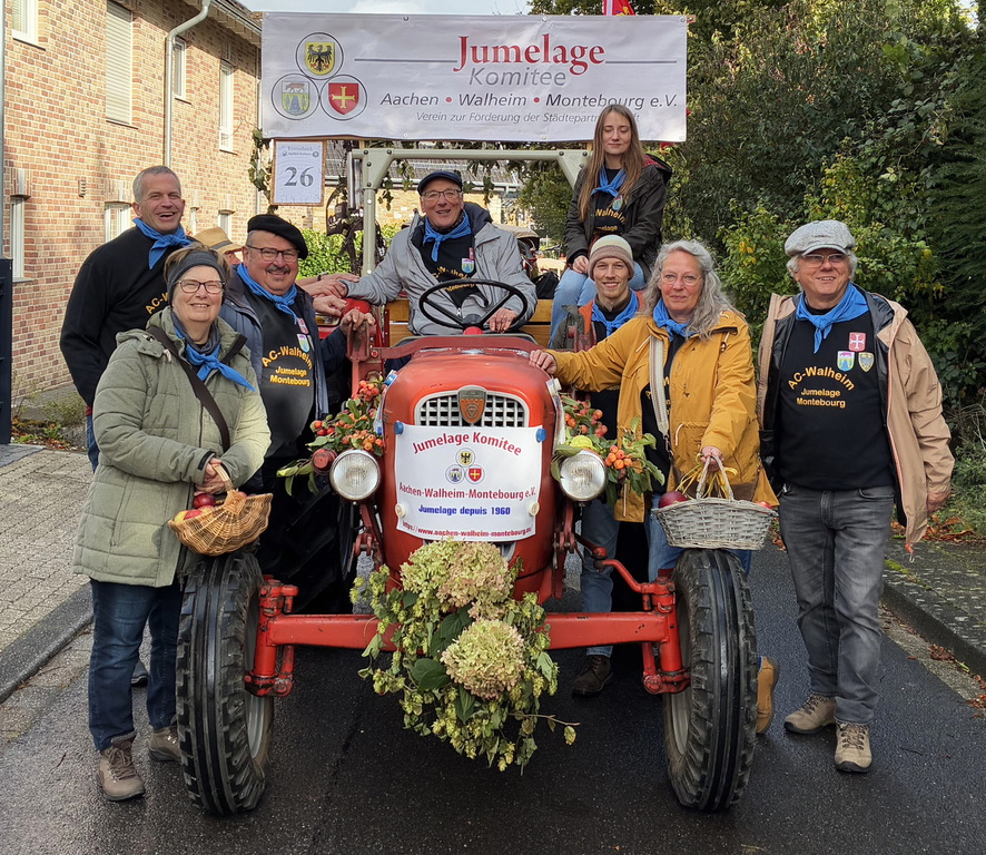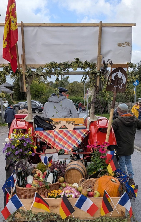 Mit dem herbstlich dekorierten Traktor haben wir so einige Liter besten normannischen Cidre transportiert, um ihn den Zuschauern am Wegrand ausschenken zu können.